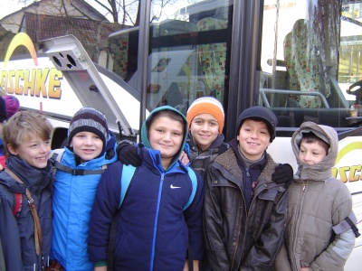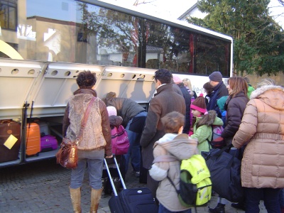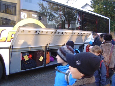 Um 8.10 Uhr kam er endlich an. Der Busfahrer verstaute mit Hilfe der Eltern unser Gepäck. Hintereinander stiegen wir in den Bus. Dann fuhren wir los. Zum Abschied winkten wir den Eltern zu. |