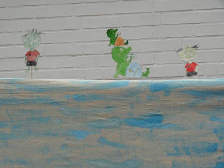 Zuerst bastelten wir die dazu benötigten Olchis, den Olchi Drachen Feuerstuhl und die entsprechenden Requisiten, die wir auf Holzstäbchen befestigten. |
