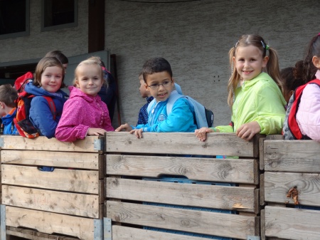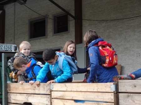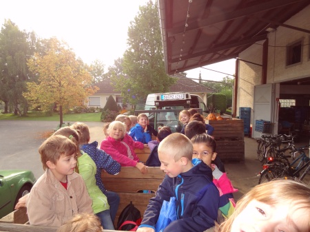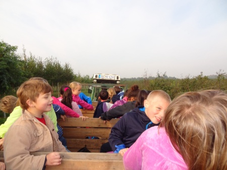 Wir durften in die Anhänger klettern und Herr Felten fuhr mit uns durch die Felder zu einer Obstplantage. |
