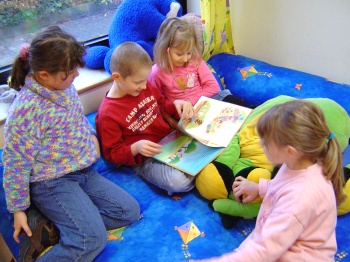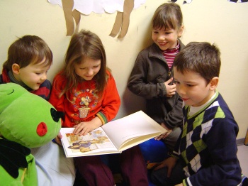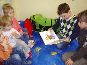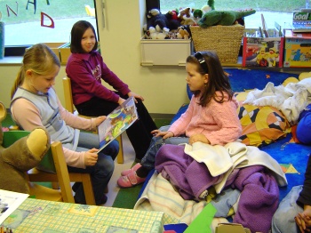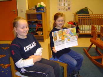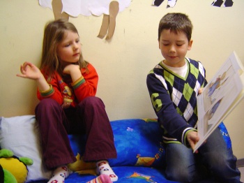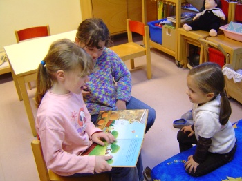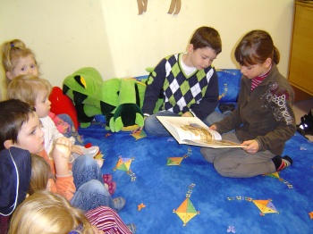 zeigte uns den Gruppenraum, in dem wir vorlesen sollten. Wir zogen unsere
